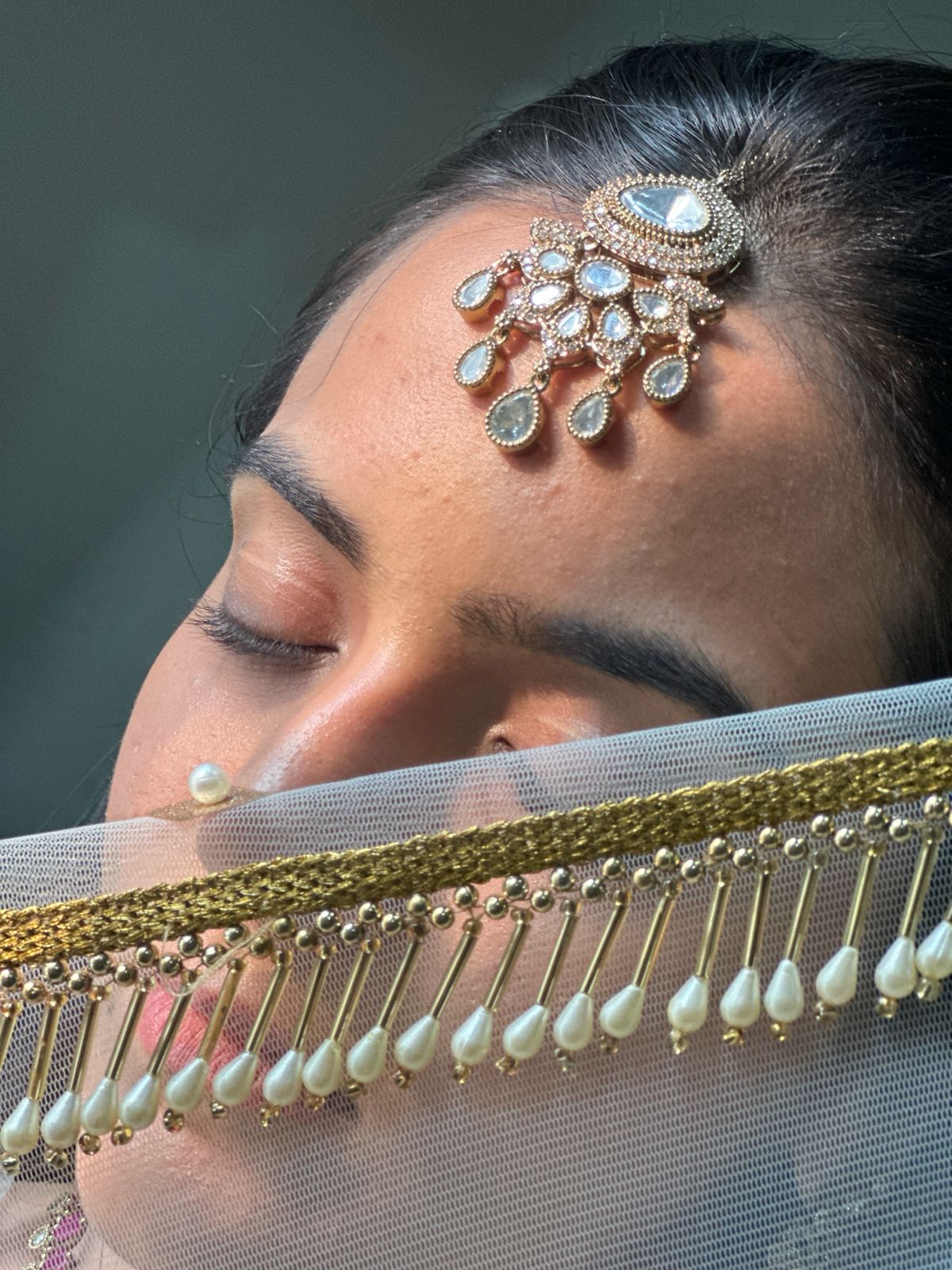 A bold, elaborate set designed for weddings or major festivities with ruby accents and dangling elements